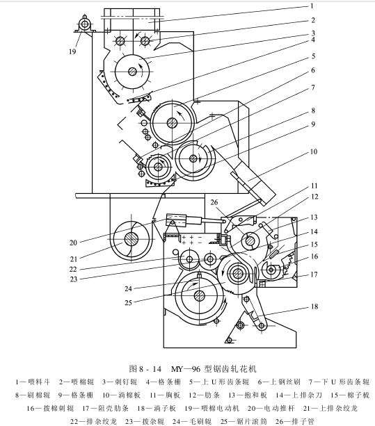 Zigzag printing MY—type zigzag gin (1) The structure and working principle of the MY-96 sawtooth gin The structure diagram of the MY-96 sawtooth gin is shown in Figure 8-14, and th…