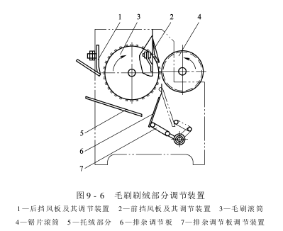 (6 ) Rear windshield: As shown in Figure 9-6, the rear windshield is located behind the brush drum, and is opposite to the pile support plate up and down to form a passage for the short pile to the pile collection tube. Its function is to cut the high-speed airflow layer on the surface of the brush drum and block the airflow from rotating around the brush drum, so that the short pile and airflow are blown to the short pile path and are not brought back to the upper space by the brush drum. Because the rear windshield blocks the airflow, a negative pressure is formed in the upper space of the brush roller. There is supplementary air between the front windshield and the saw blade roller to blow the short lint on the saw teeth.