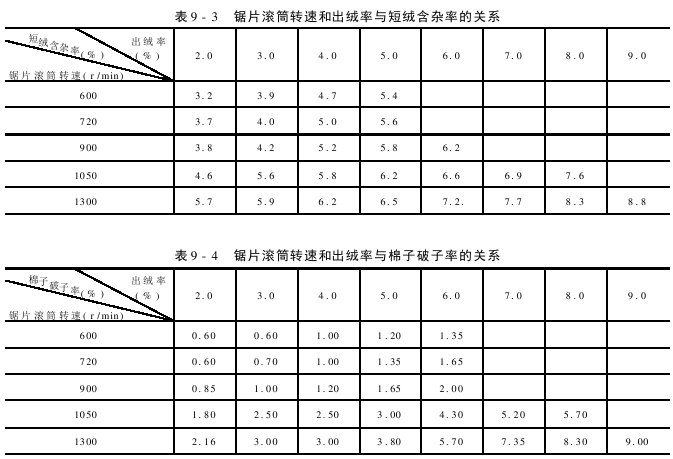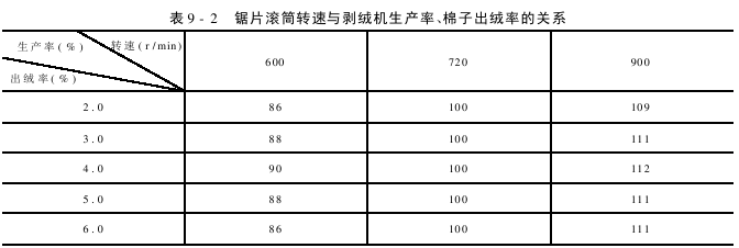 The speed of the saw blade drum is one of the important factors that determines the productivity of the stripping machine. The relationship between saw blade drum speed, lint stripping machine productivity and cotton lint yield is shown in Table 9-2. The relationship between the rotation speed of the saw blade drum and the lint yield, the impurity content of short lint and the broken cotton seed rate are shown in Table 9-3 and Table 9-4.