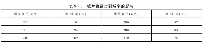 The diameter of the saw blade is large, the arc of the saw blade extending into the work box is long, the number of working teeth is large, and the stripping efficiency is high; the diameter of the saw blade is small, the arc of the saw blade extending into the work box is short, and the number of working teeth is small , low stripping rate. The effect of saw blade diameter on stripping rate is shown in Table 9-5.