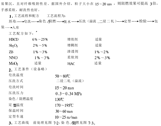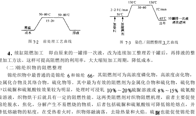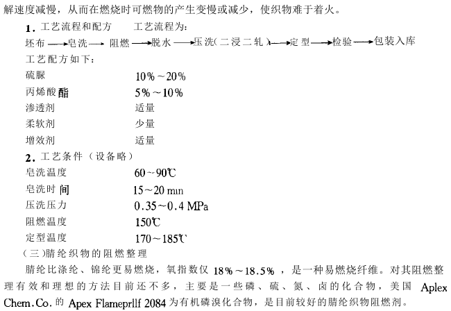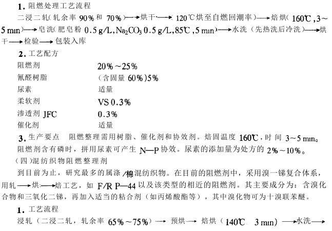 The fireproofing post-finishing process is to use fireproofing agents and other additives to adsorb, penetrate and diffuse to the surface and interior of the fabric fibers using the high temperature and high pressure bath method under certain conditions of pressure, temperature and time, so that they can interact with the fibers. The active groups in the molecular structure bond to form a macromolecular network structure. Or use padding, spraying, or PU coating methods to deposit and fix the fire retardant on the surface of the fabric fibers to obtain a certain fire retardant effect and washability.