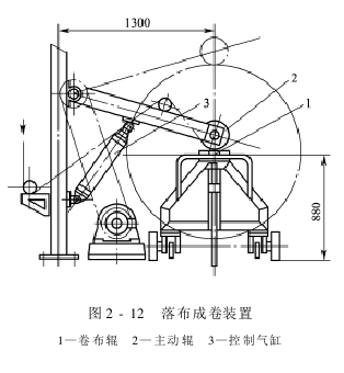 The surface drive cloth rolling device consists of an active rubber roller for rolling cloth, a lifting rocker arm frame, etc. The active rubber roller on it is pressed tightly behind the cloth rolling roller of the drop-off car, and relies on friction to drive the cloth rolling roller to rotate and roll the cloth. As the diameter of the cloth roll increases, the rocker arm frame and the driving rubber roller also rise. After the roll is filled with the shaft, the machine immediately stops, opens the air valve, and lifts the rocker arm and the driving rubber roller away from the cloth roll.