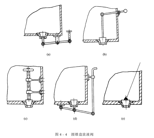 (1) Conical disc drain valve: There are foot-operated conical disc drain valve [see Figure 4-4(a)] and hand-operated conical disc drain valve [see Figure 4-4(b))], manual screw type conical disc drain valve [see Figure 4-4(c)], hand-operated lever type conical disc drain valve [see Figure 4-4(d)], hand-operated conical disc drain valve [See Figure 4-4(e)] There are several types, and the two commonly used ones are the foot-operated cone disc drain valve and the hand-operated cone disc drain valve.