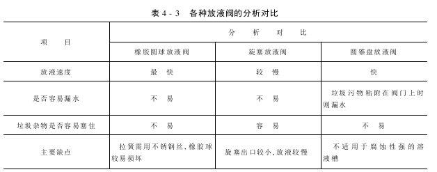(3) Rubber ball drain valve: It is used for stainless steel sinks, as shown in Figure 4-6. Place a soft rubber ball at the liquid outlet of the stainless steel tank. The outer diameter of the ball should be larger than the inner diameter of the liquid outlet. There are cylindrical pins at both ends of the ball and the liquid outlet pipe. Two stainless steel tension springs are installed between the pins. Use spring tension to tightly block the drain port with the ball. When discharging liquid, the operator can pull the ball away from the liquid discharging port. This structure is suitable for cold or warm water sinks. The analysis and comparison of various drain valves are shown in Table 4-3.