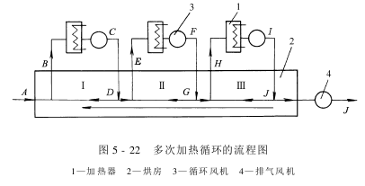Figure 5-22 is a flow chart of multiple heating cycles. The fresh air added from point A and the return air from point D in room I are mixed to form point B. It is heated by the heater to point C, and is transported to the drying room by the circulating fan, where it contacts the fabric and changes to state D.