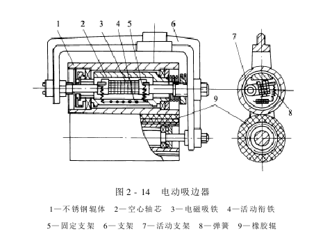 Figure 2-14 shows an electric edge suction device that is currently widely used in China. Its pair of pressure rollers consists of a stainless steel roller and a rubber roller. The stainless steel roller is equipped with a fixed electromagnetic magnet and a movable armature. A spring is installed between the suction iron and the armature, the fixed suction iron is installed on the bracket, and the movable armature is connected to the stainless steel roller body. When the fabric is running normally, the space between the two rollers is pressurized by the suction spring, and the suction forces on both sides of the open-width fabric are equal. When the fabric deflects, it touches the contact rod, and through the operating element, the suction iron works, overcoming the spring pressure, causing a pair of pressure rollers to disengage and release the pressure, and the fabric moves back to the other side, thereby correcting the deflection.