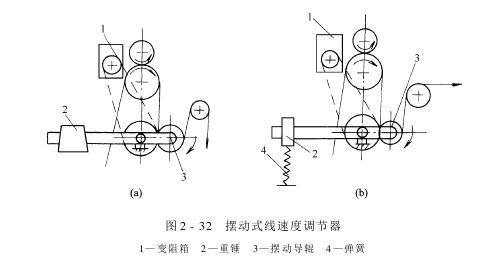 Figure 2-31 is a schematic diagram of the lifting linear speed regulator. It is mainly composed of cloth guide roller, sprocket, rheostat box and frame. According to the number of cloth guide rollers, the lifting linear speed regulator can be divided into three-roller type and five-roller type, as shown in Figure 2-31(a) and Figure 2-31(b).