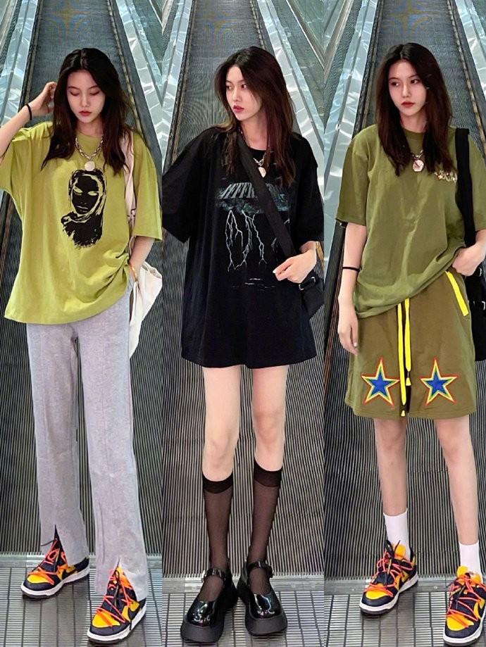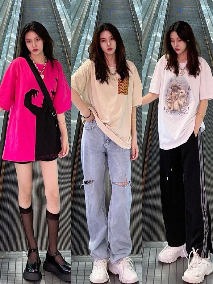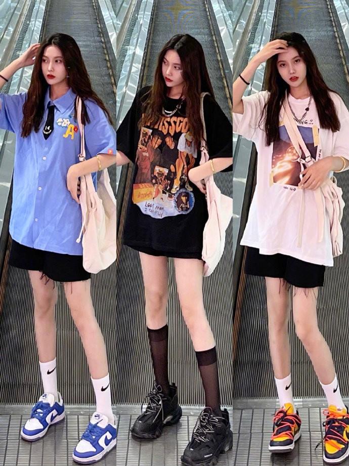 This year’s sweet and cool style is favored by many fashionable women. Loose T-shirts often give people a neutral feeling. But paired with black stockings, it just balances it out and adds a bit of femininity.