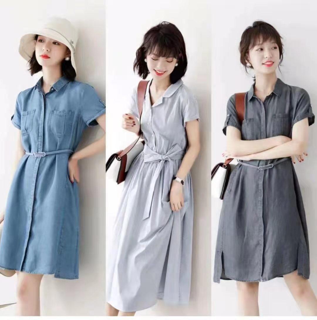 The blue denim shirt dress is above the knee and is very height-friendly. The skirt belt has a waist-cinching design, and a simple belt creates a high-end look.