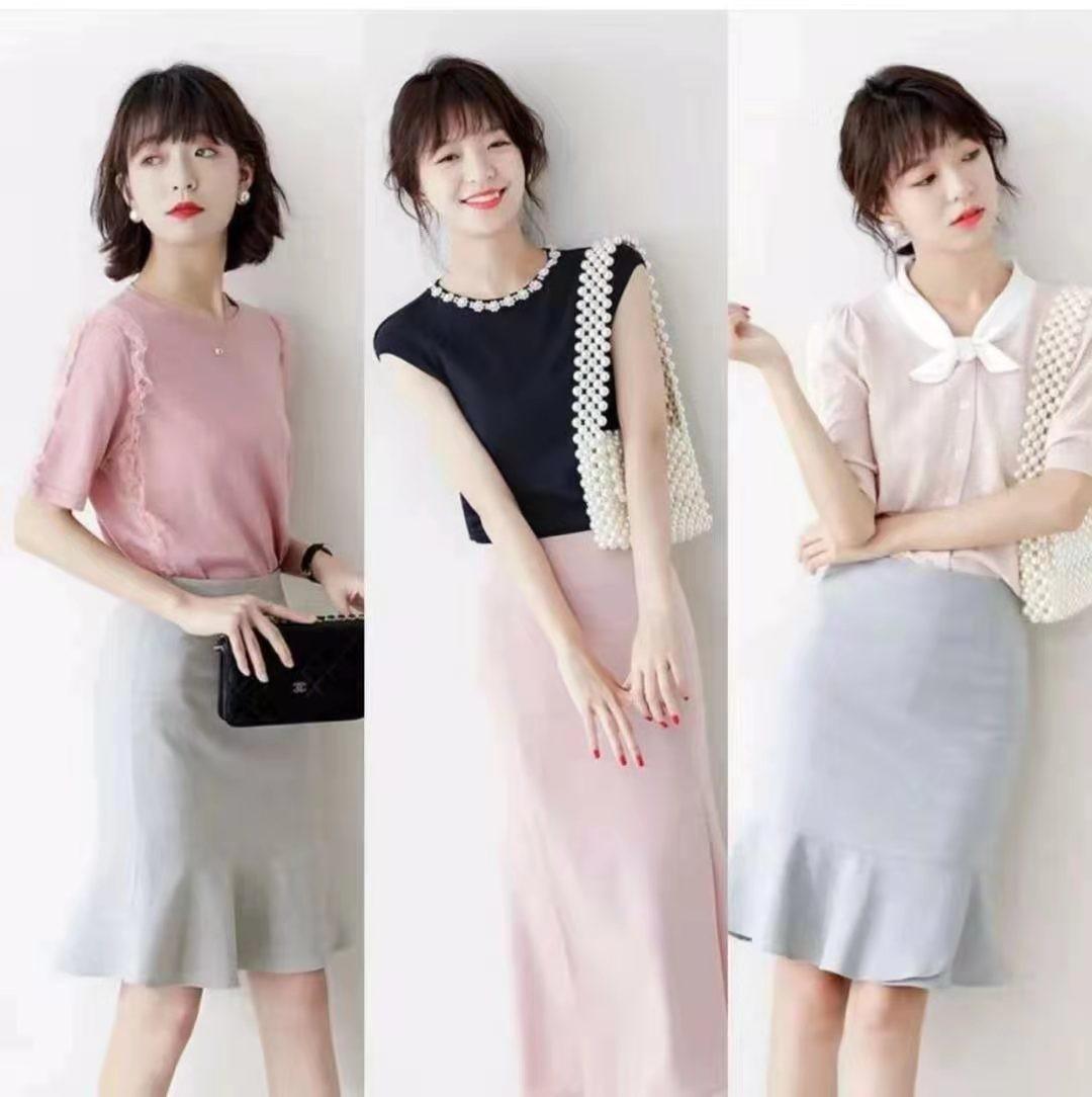 A light pink top paired with a mint green skirt is very feminine in the workplace. You can also use white to match haze blue color. The hip-covering skirt with a fishtail style has certain requirements for the figure. If you wear it well, you will have the taste of a mature woman.
