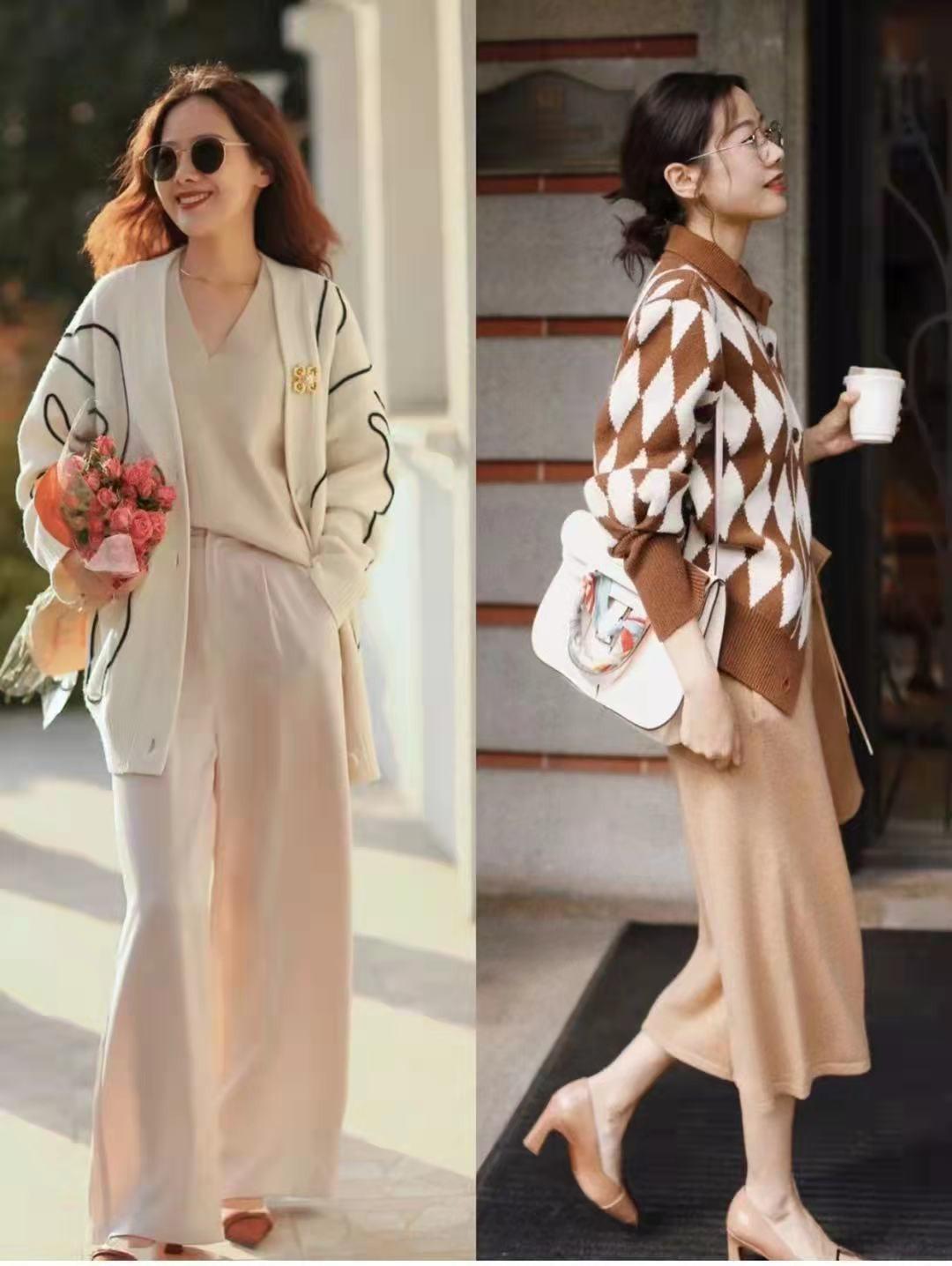 For knitted sweater-type items, you can also choose a knitted cardigan as a jacket. A mid-length jacket is paired with wide-leg pants and a skirt. It exudes a gentle temperament from the inside out that is very ladylike, and is in line with what women around 30 years old want. A kind of light and familiar style pursued.