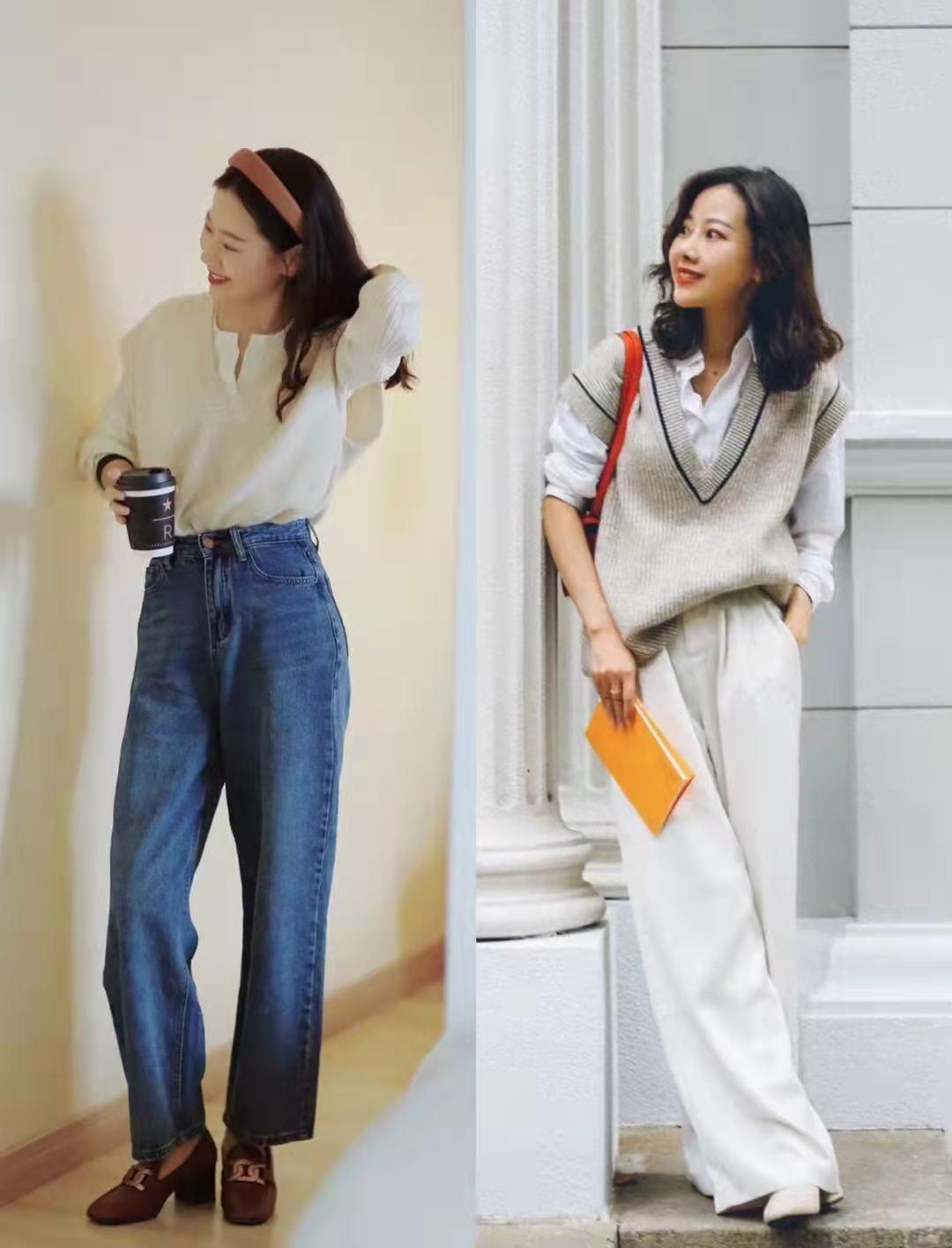 Knitted sweaters must be layered. The most representative one is a knitted vest paired with a shirt. A light gray knitted vest is paired with a white shirt. The combination of light colors throughout the body creates a sense of fashion and is very age-reducing.
