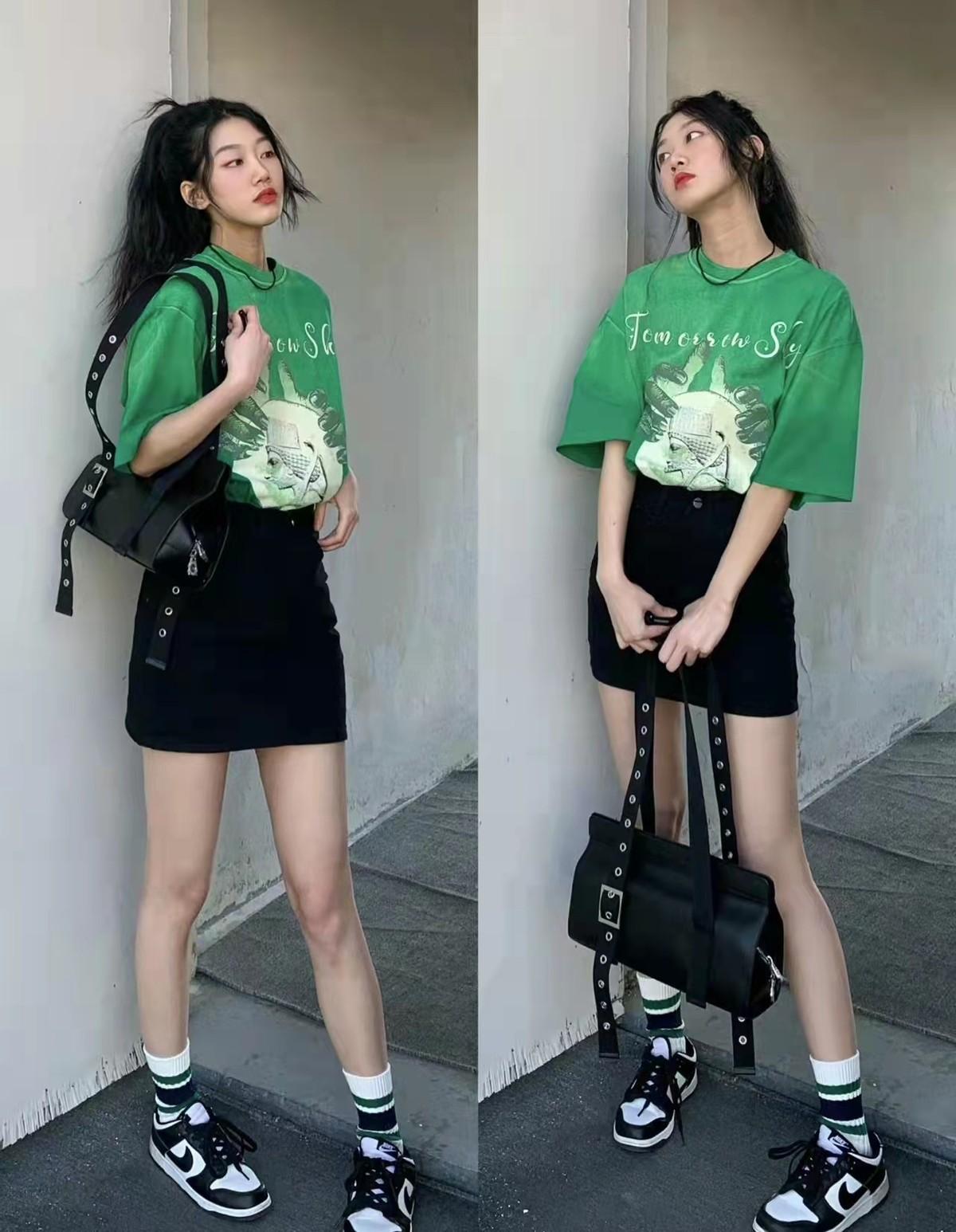 Green T-shirt, paired with a slightly tight skirt.The skirt and shoes are the same color, and the socks are made of Small detail adjustments, with green color, have a good echo effect in color.