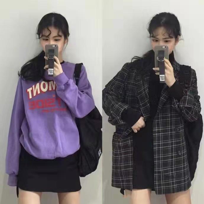 The purple letter-shaped sweatshirt is loose and casual. When paired with a black skirt, it can create a lazy look for daily outings. Suits can also be worn outside skirts, giving us a feeling of missing lower body.