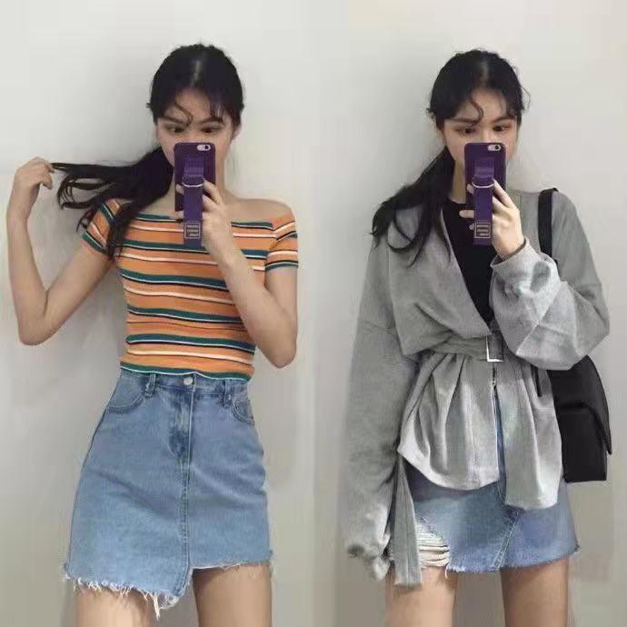 The best outfit to highlight your figure is this outfit. The striped slim-fit shoulder-length piece paired with an irregular close-fitting denim skirt perfectly shows off the person’s small waist and S-shaped lines.