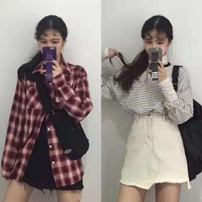 A black raw-edged skirt often makes the overall look more bold and innovative. This red plaid shirt and black skirt are classic when paired together. .
