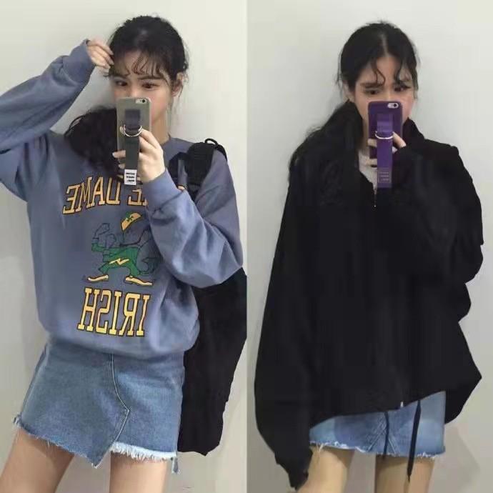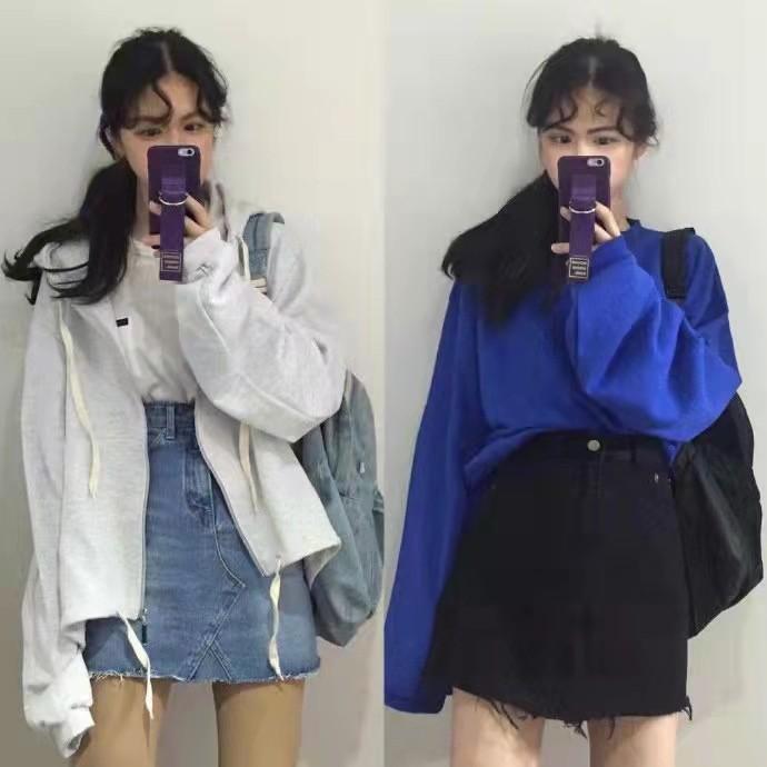 Pair it with a gray sweatshirt on the outside to make the whole person look neat and casual. A blue large-size sweatshirt and a black hip-hugging skirt are equally elegant. Trendy atmosphere.