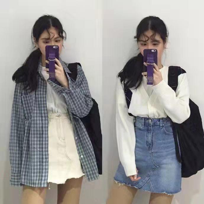 The combination of a shirt and a skirt is simply perfect. The gray-blue plaid shirt and the white hip-hugging skirt look both bright and dark, and the color contrast is perfect. The combination of a denim high-waisted hip skirt and a V-neck knitted top is a model for our daily commuting.