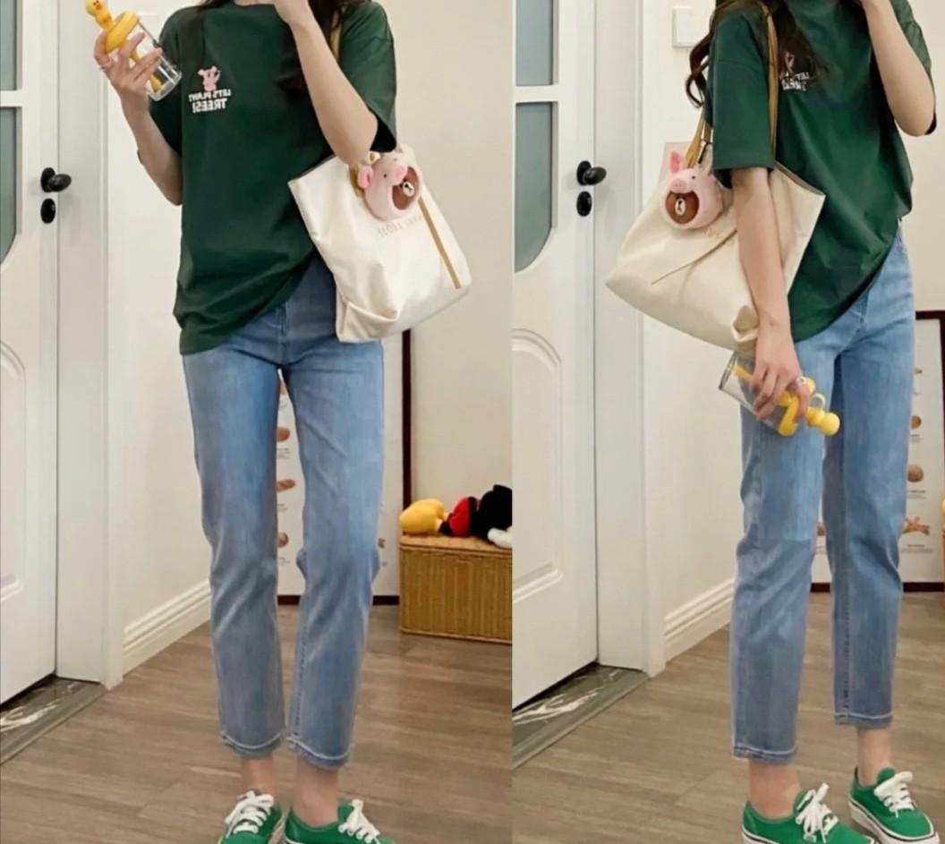 A dark green loose T-shirt, paired with nine-point jeans. This style is very casual and has a simple design. The two items match each other, so the outfit won’t be too cumbersome.
