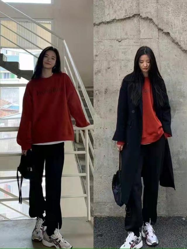 When choosing the color of a sweatshirt in autumn and winter, you can consider the burgundy color that fits the autumn and winter atmosphere. Use a mix of classic colors. Use a white T-shirt as the base, showing a strong casual atmosphere. Paired with a black coat on the outside, it creates a stylish color matching and gives a full street feel.