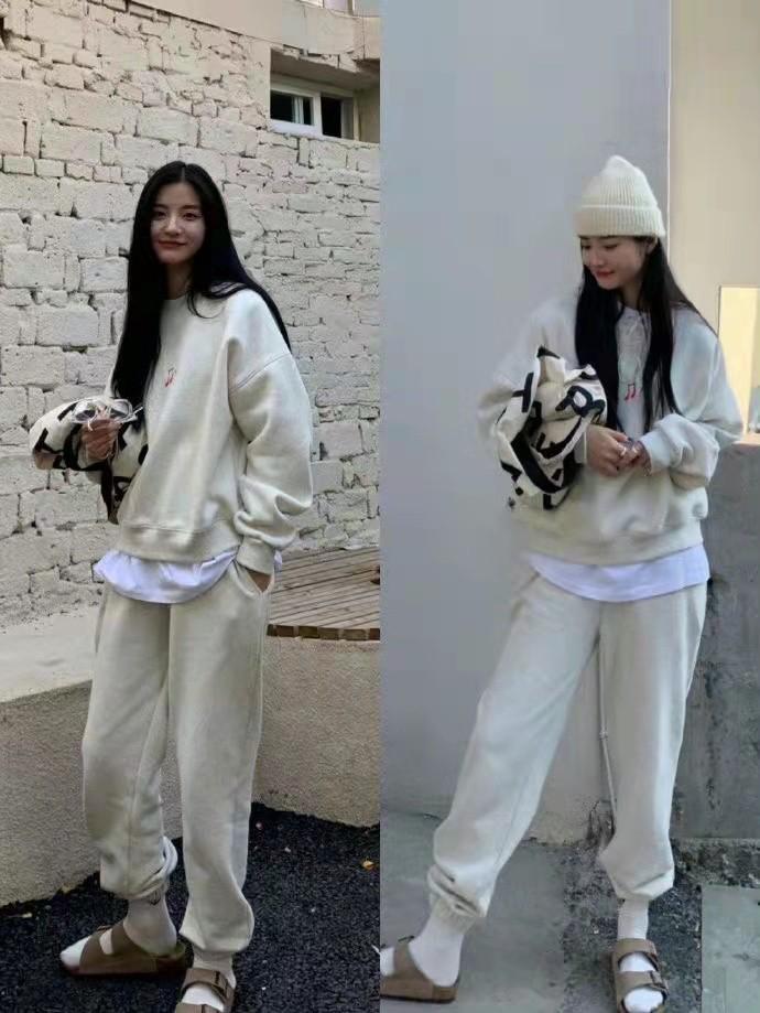 If you don’t want to wear too dull and heavy clothes in winter, you can not only make changes in the fabric of the item, but also in the color selection. Change. Choose this beautiful white sweatshirt set to look refreshing and look younger.