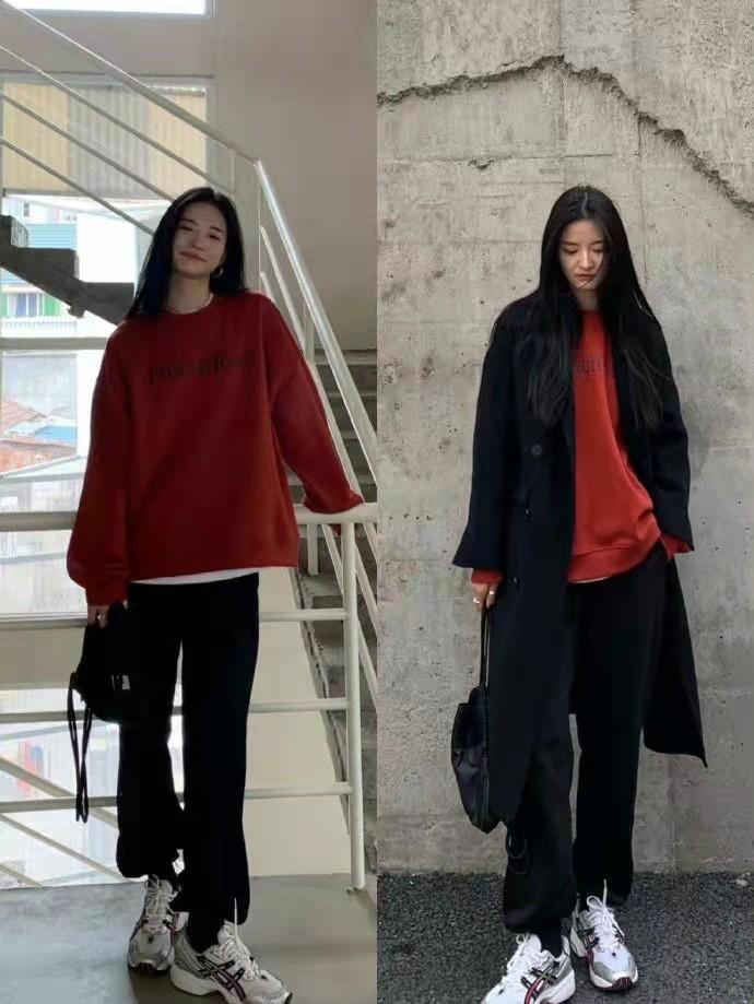 In the sporty style, of course, the combination of a sweatshirt and sneakers is indispensable. Like this retro red letter printed sweatshirt, the design is grand and classic , wear a white T-shirt underneath, with a small section of white base exposed at the hem, adding a refreshing and age-reducing look.