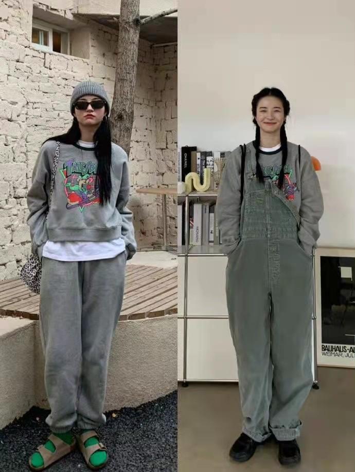 The gray sweatshirt is paired with a black culottes suit. This novel style Clothing, which is not commonly used in daily matching, shows the avant-garde style and personality.