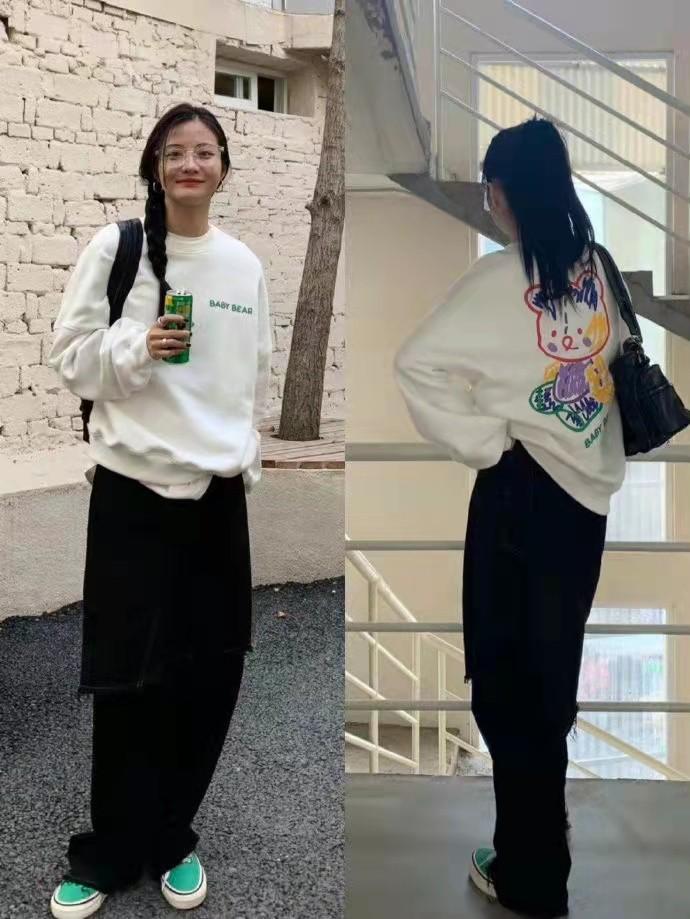 Speaking of white sweatshirts, they are actually very versatile. Pairing the lower body with simple black trousers not only makes you look slimmer, but also makes use of the high waistline. To optimize body proportions and increase the sense of being capable and neat.