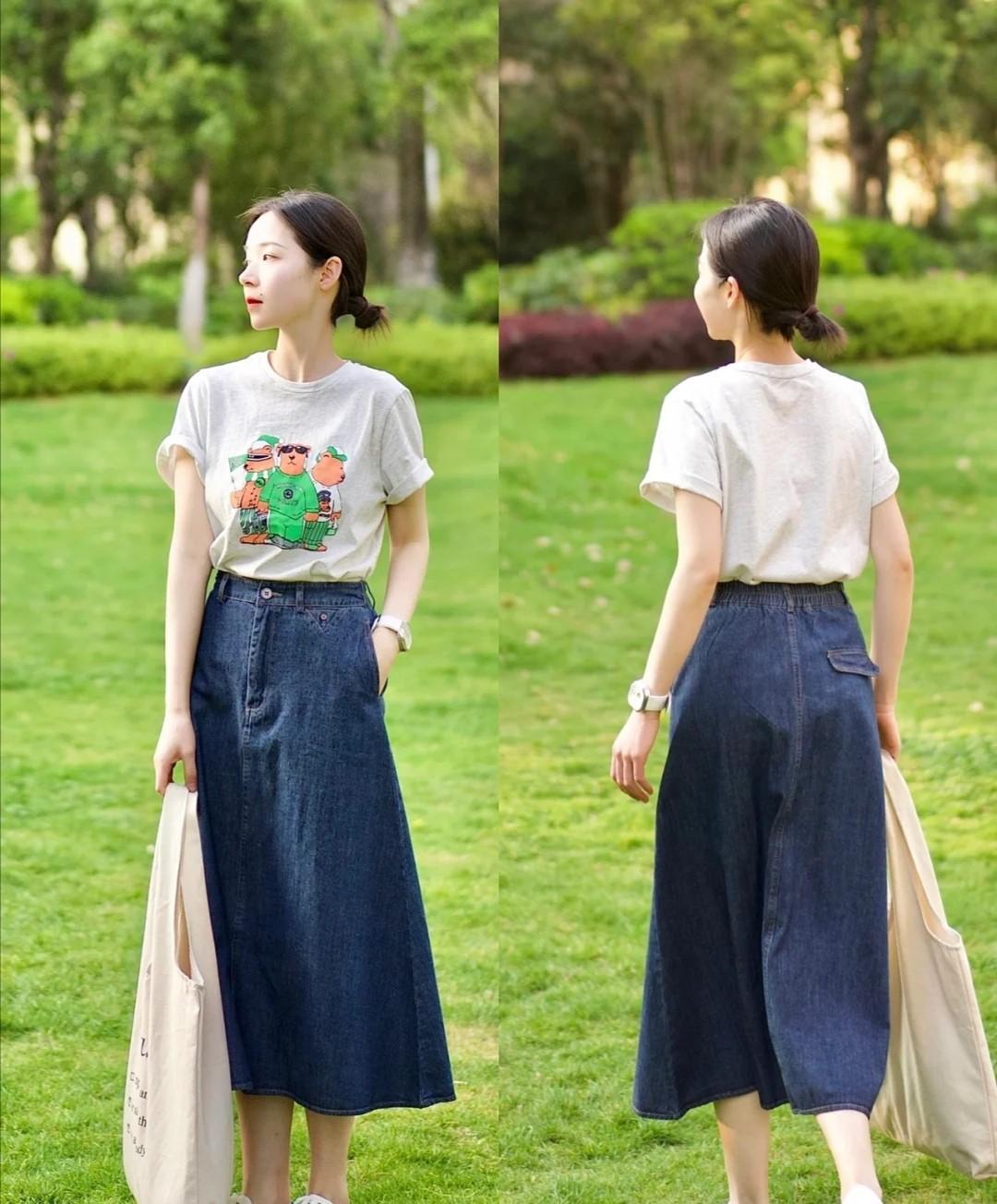For example, this set of outfits is full of youthful vitality and can highlight obvious elegance and charm. The light-colored printed T-shirt is full of childlike charm, and combined with the blue denim knee-length skirt, it is high-end and unique