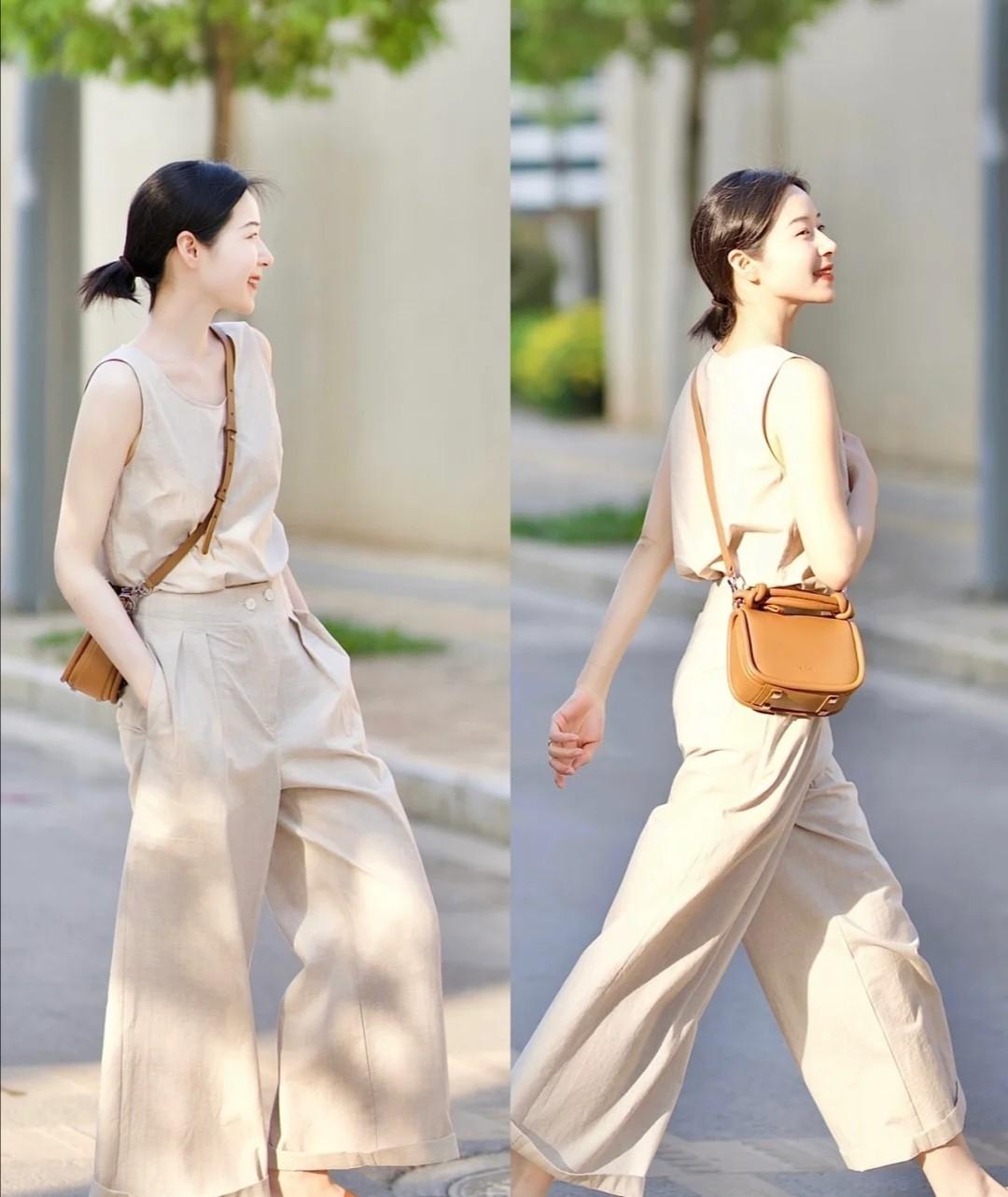 This group of outfits is generous and natural. The matching of the same color makes the overall outfit plan faster, and the sleeveless T-shirt can increase the efficiency. With a sexual atmosphere, loose wide-leg pants enhance the free and easy style.