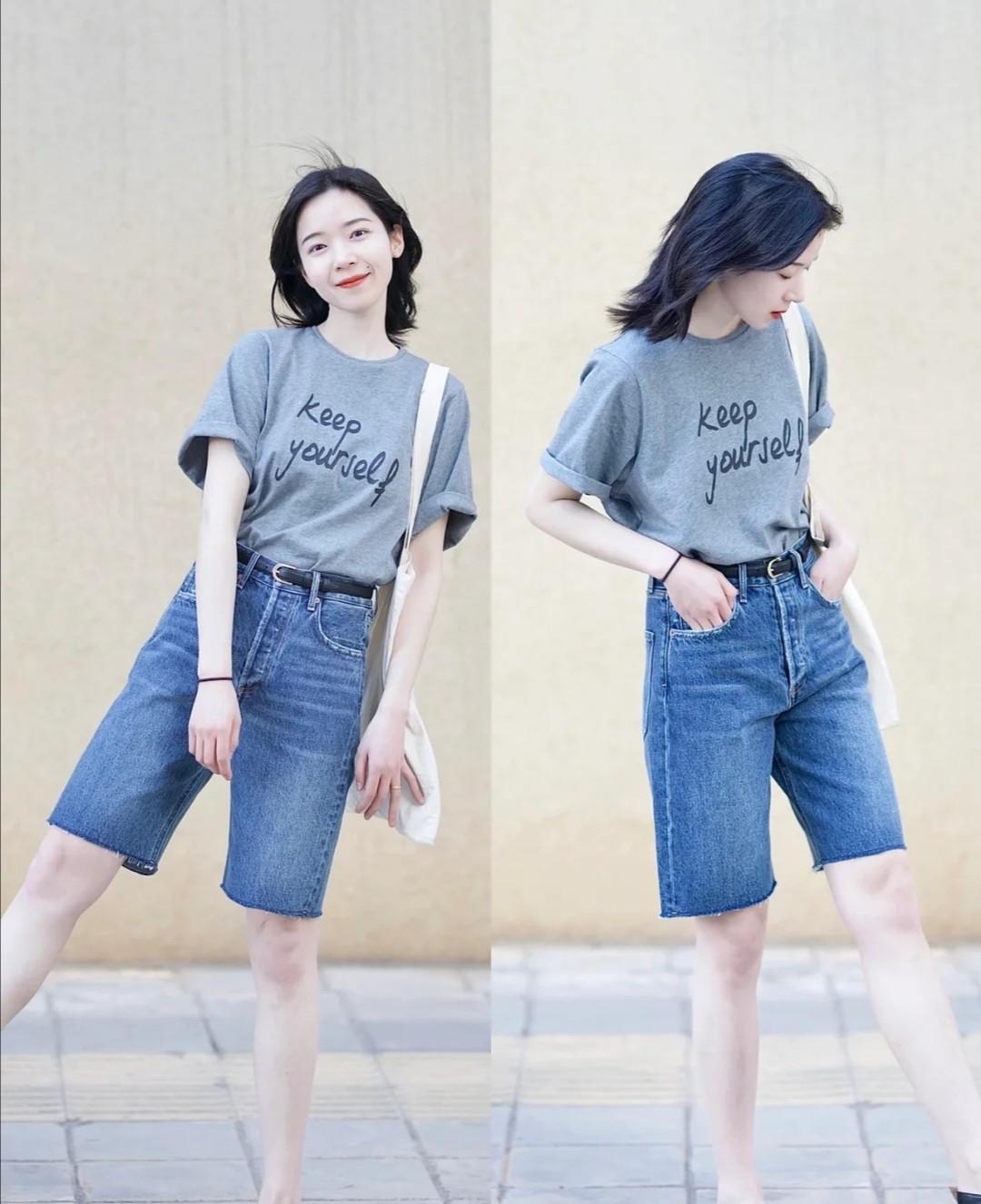 Although blue denim shorts are not as versatile as black, they are not a garment with too many limitations. They can be worn with The upper body is paired with simple T-shirts in various colors. For example, the combination of a light gray T-shirt and jeans is very energetic.
