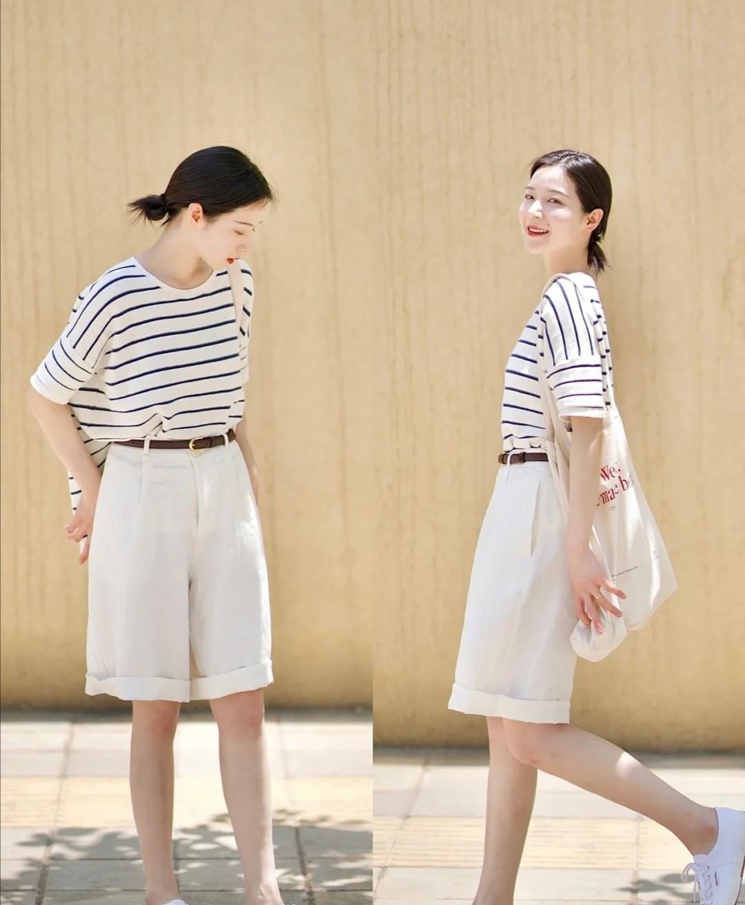 Solid color T-shirts can easily cause visual fatigue. If you want to change your dressing style and use T-shirts to complete some age-reducing outfits, you can use white striped T-shirts. The color selection is very everyday and down-to-earth.