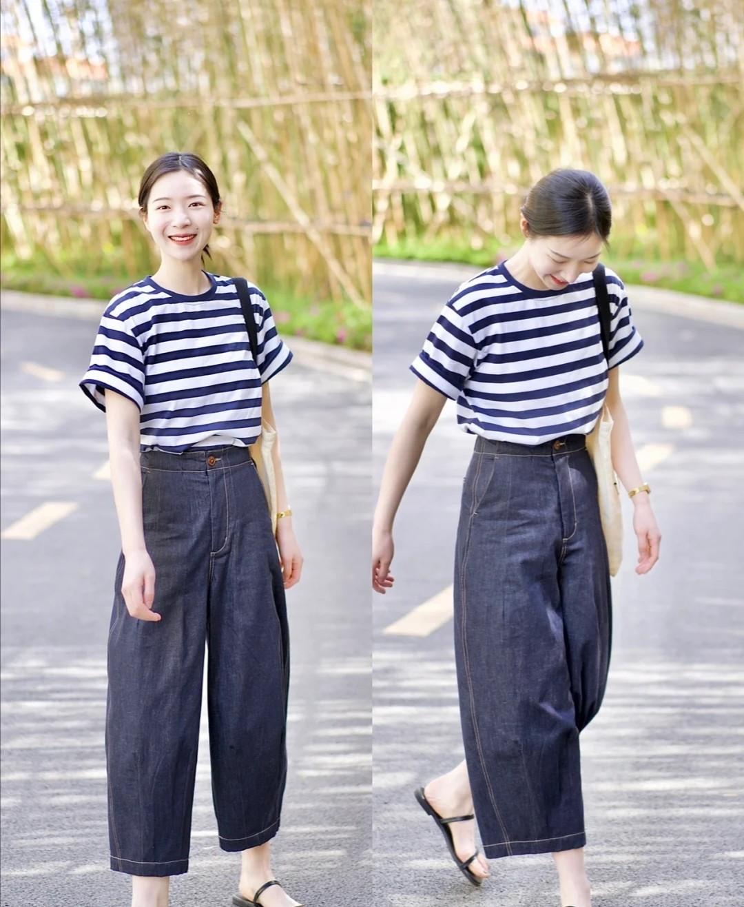Striped T-shirt is a very popular item. The arrangement and combination of various colors can enrich women’s clothing choices. a lot of. Mainly composed of white and blue, the picture is generous and high-end. Combined with dark wide-leg pants, the outfit is simple, comfortable and decent.
