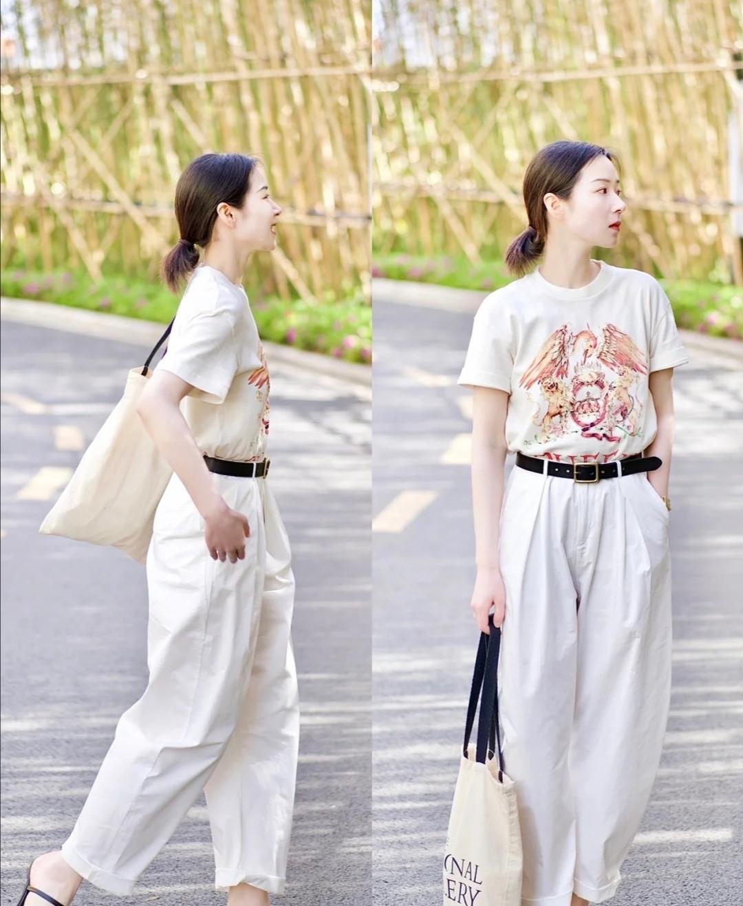 For example, these white wide-leg pants are absolutely fresh and a classic garment that can be used for many years. Combined with the upper body Printed T-shirts, keep the same color matching, and it will not be monotonous.