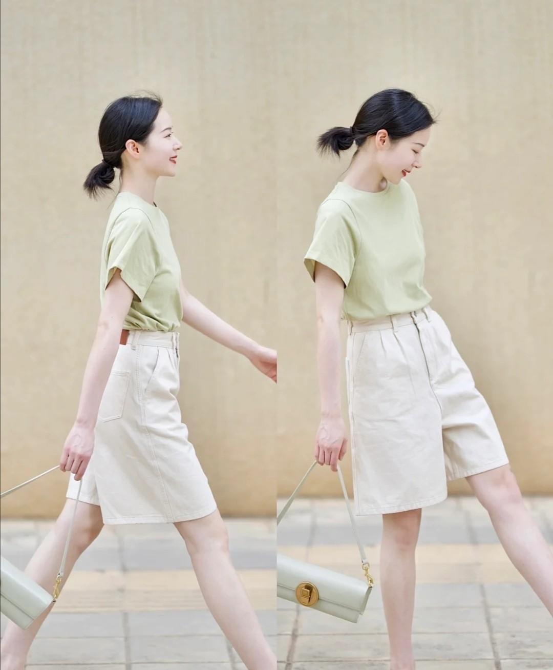 If you want to find the coolest matching formula, you can combine shorts and a T-shirt. For example, in this outfit, the green T-shirt exudes an age-reducing atmosphere, and the white shorts create a comfortable dressing experience. The combination of the two, the color matching is also Not corny or boring.