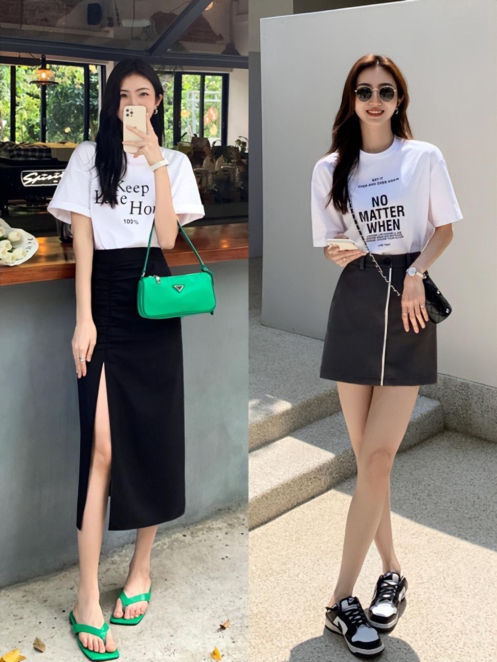There are many ways to wear T-shirts. If you want to show your elegance, it is recommended that you pair your lower body with these gentle skirts and use a high-waisted long skirt. Pair it with a short T-shirt to stretch your proportions and your figure will look better.