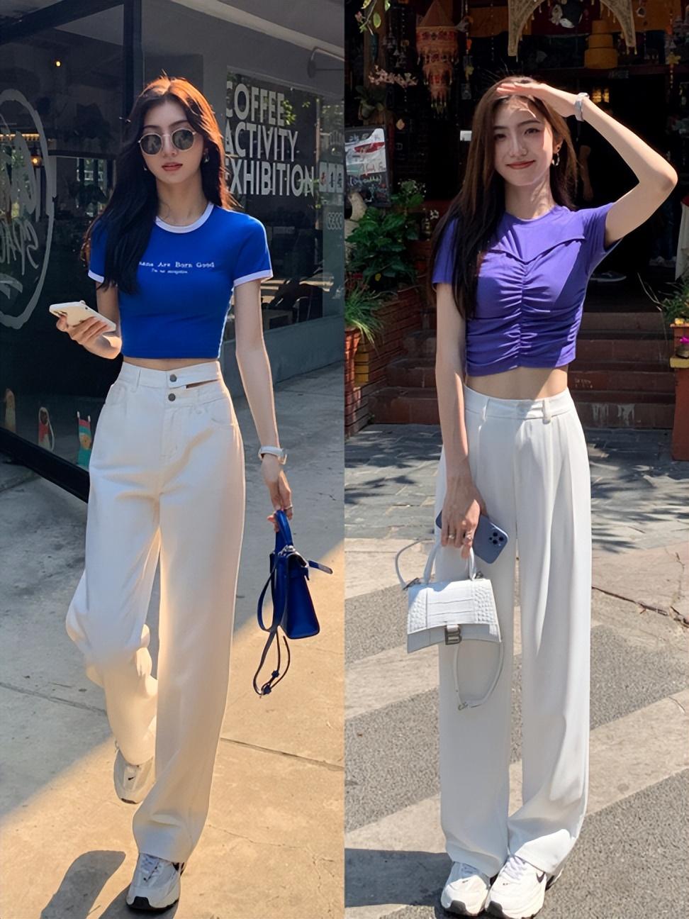 White T-shirts are simple and fashionable. Pure white short T-shirts are also very simple and attractive. The small waist can show off the wearer’s good figure. If you don’t have fat on your abdomen, you can try more of this personalized item.