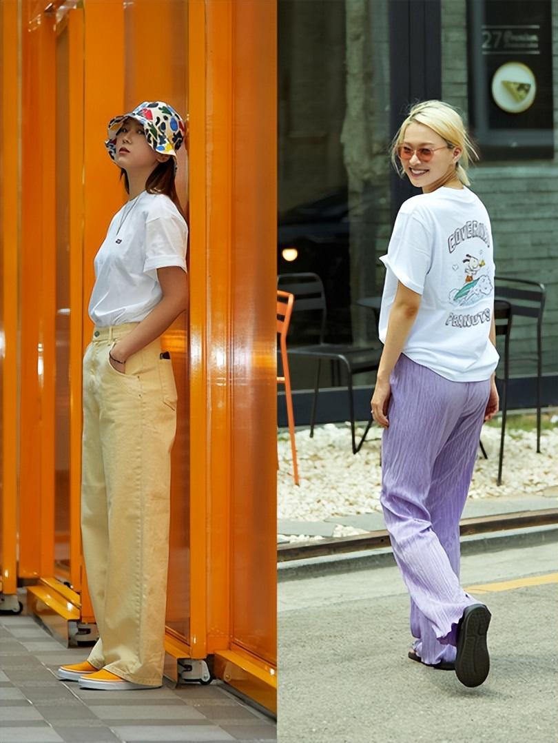 When wearing a T-shirt, you can also create a certain contrast in color, such as this colorful T-shirt paired with khaki pants or beige pants.