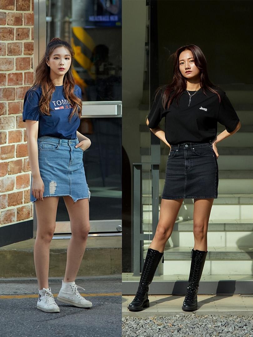 T-shirt paired with skirt is gentle, fashionable and feminine. This kind of denim skirt is really elegant and romantic, and the length of the skirt is in the middle of our thighs, which is also suitable for girls with wide hips and thick legs. For the modification effect, if you combine it with a short T-shirt, the improvement ratio will be greatly increased.