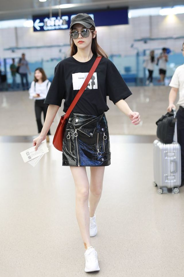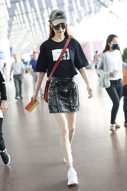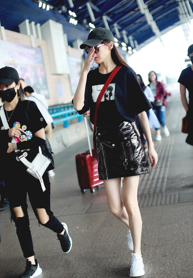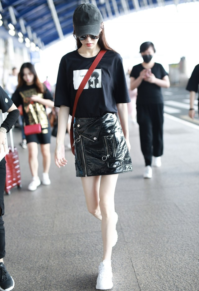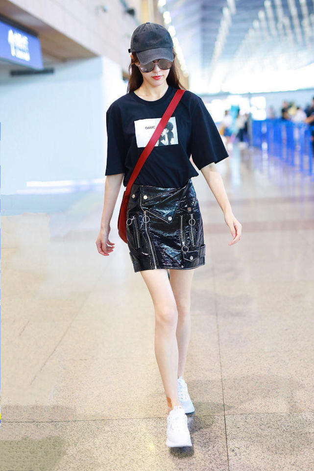 A black T-shirt with white prints, a black skirt with glossy leather material, and the use of tucked-in corners to add a sense of layering She showed herself vividly and dressed very elegantly, so Tang Yan not only has a good figure but also has a first-class sense of fashion. Wearing a black T-shirt and a skirt, she is full of femininity.