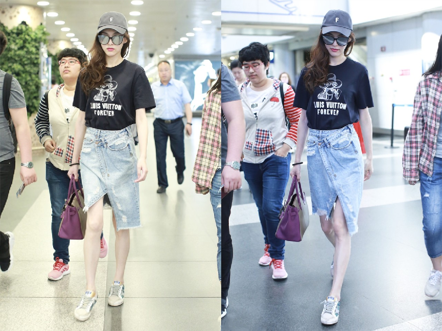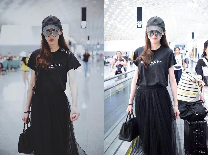 Tang Yan chooses a black T-shirt and a black skirt for her daily wear. The overall black look not only does not look dull , due to the blessing of printing and the collision of the two fabrics, the shape and layering will be revealed, which looks good when paired together.