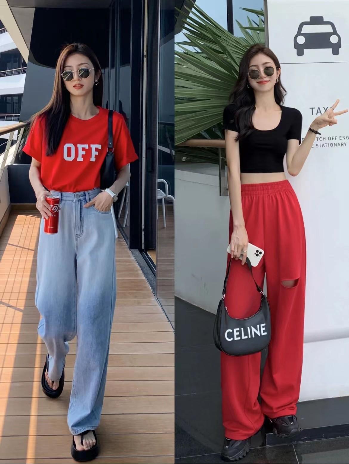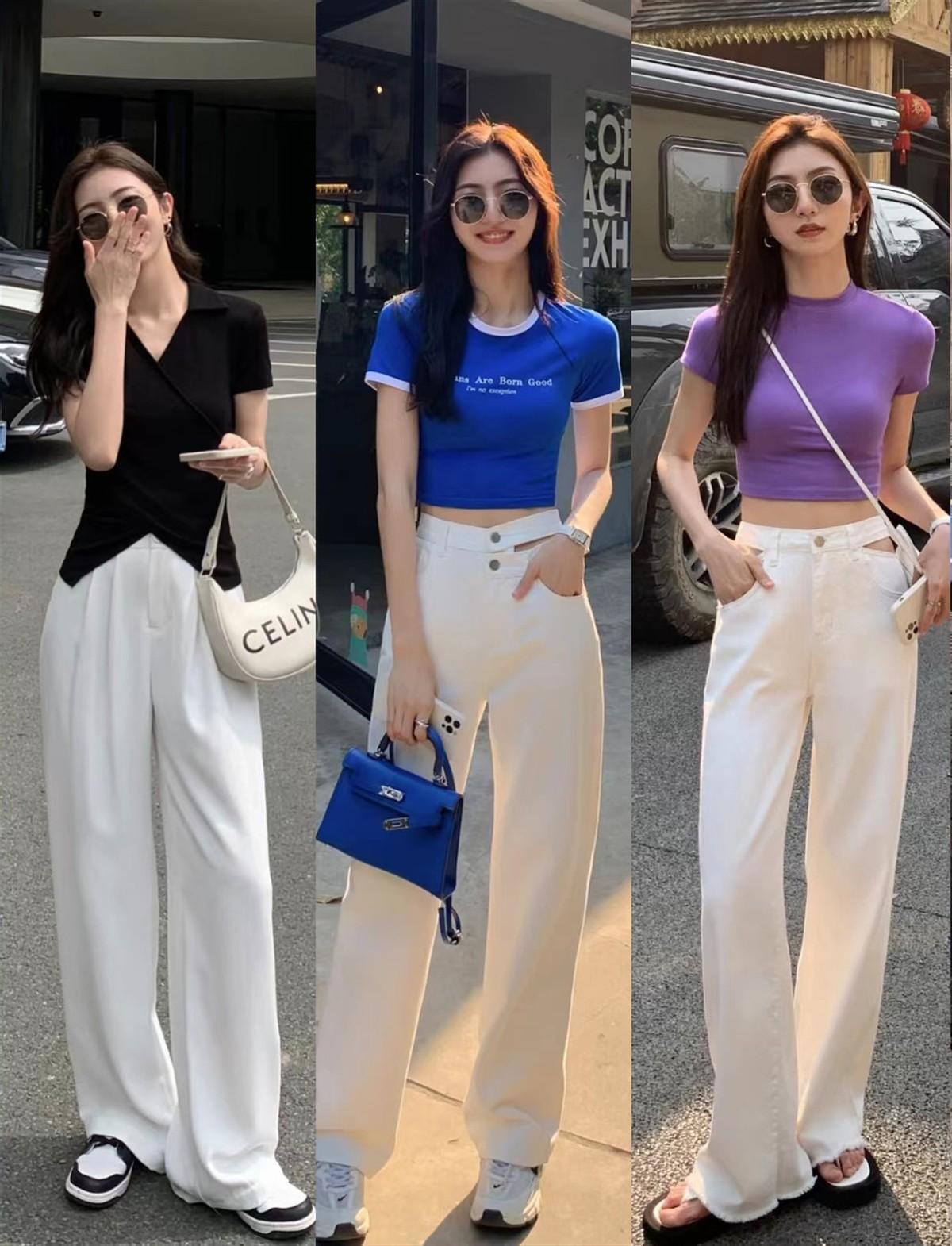 Minimalist trousers + slim fit + wide-leg styles have corresponding wear styles. They can modify the figure and highlight the texture, and match with colors T-shirts will not appear to be a single outfit, and they can be worn appropriately to expose the skin, and the slight exposure of the figure will be very focal point.