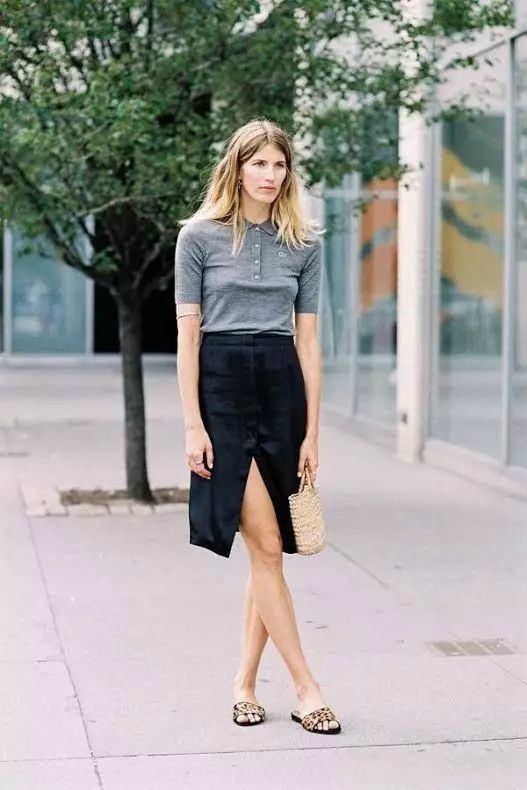 Pure gray mid-sleeve POLO shirt with elegant and quiet color, added with small white buttons for embellishment, very refreshing and capable, and highlight the slender curves of the model’s arms. Paired with a pure black skirt, the front slit highlights the sexy lines of the thighs. Underfoot are leopard print element slippers, which are relaxed and casual and exude a lazy style. Paired with a woven handbag, it instantly adds a sense of forest styleAesthetic connotation