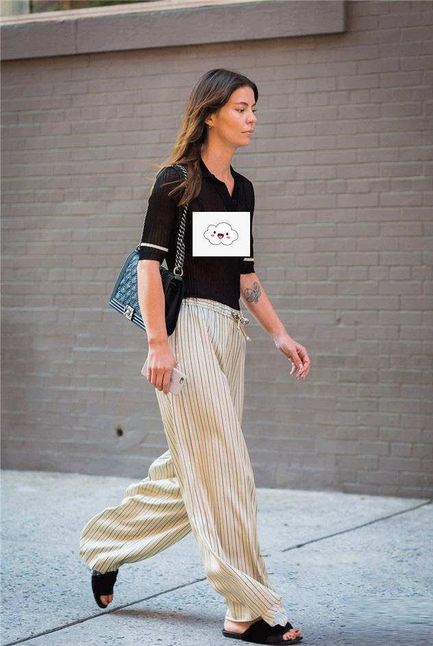 The upper body is a black semi-see-through POLO shirt, which is very clever in combining sexy atmosphere with soft and refreshing beauty. The cuffs are decorated with white horizontal stripes, adding Elegance and leisure. Paired with beige vertical striped chiffon low-waist trousers, it is full of casual and gentle atmosphere. Paired with a pair of pure black slippers, it is quite cool and has a lazy connotation. The dark green shoulder bag adds a bit of retro elegance