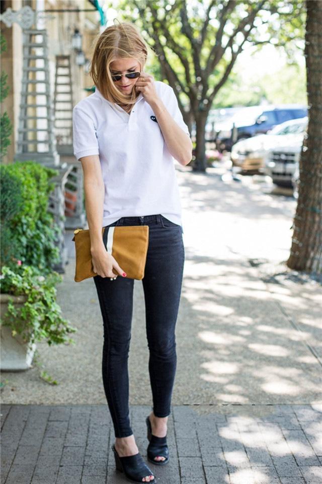 The short-sleeved white POLO shirt is refreshing and casual yet elegantSophisticated style in the workplace, with embellishments on the chest The black printed pattern, the combination of white and black, creates a rigorousdignified image. The lower body is a pair of black slim-fitting jeans, paired with black tapered shoes to highlight the slender curves of the lower body. On my hand is a khaki line clutch bag with modified lines. The overall style is dignified and simple and very straightforward