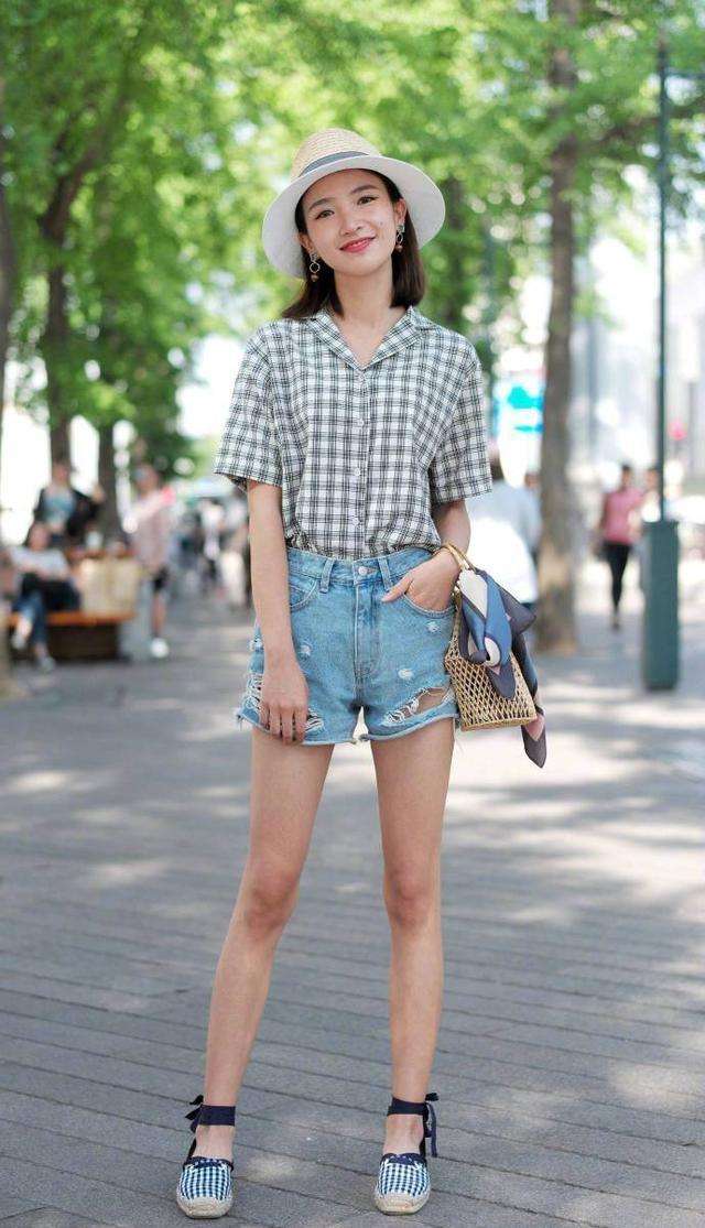 The upper body is a plain plaid POLO shirt, with elegant tones exudingforest Department College Style. The V-shaped neckline stretches the neck line, and the lower body is a pair of ripped denim shorts. The color and style of the whole set are very refreshing. Paired with leg-tie plaid canvas shoes, the design is particularly outstanding, and also contains pastoral charm. The woven handbag is embellished with silk scarves, exuding a smartexquisite charm