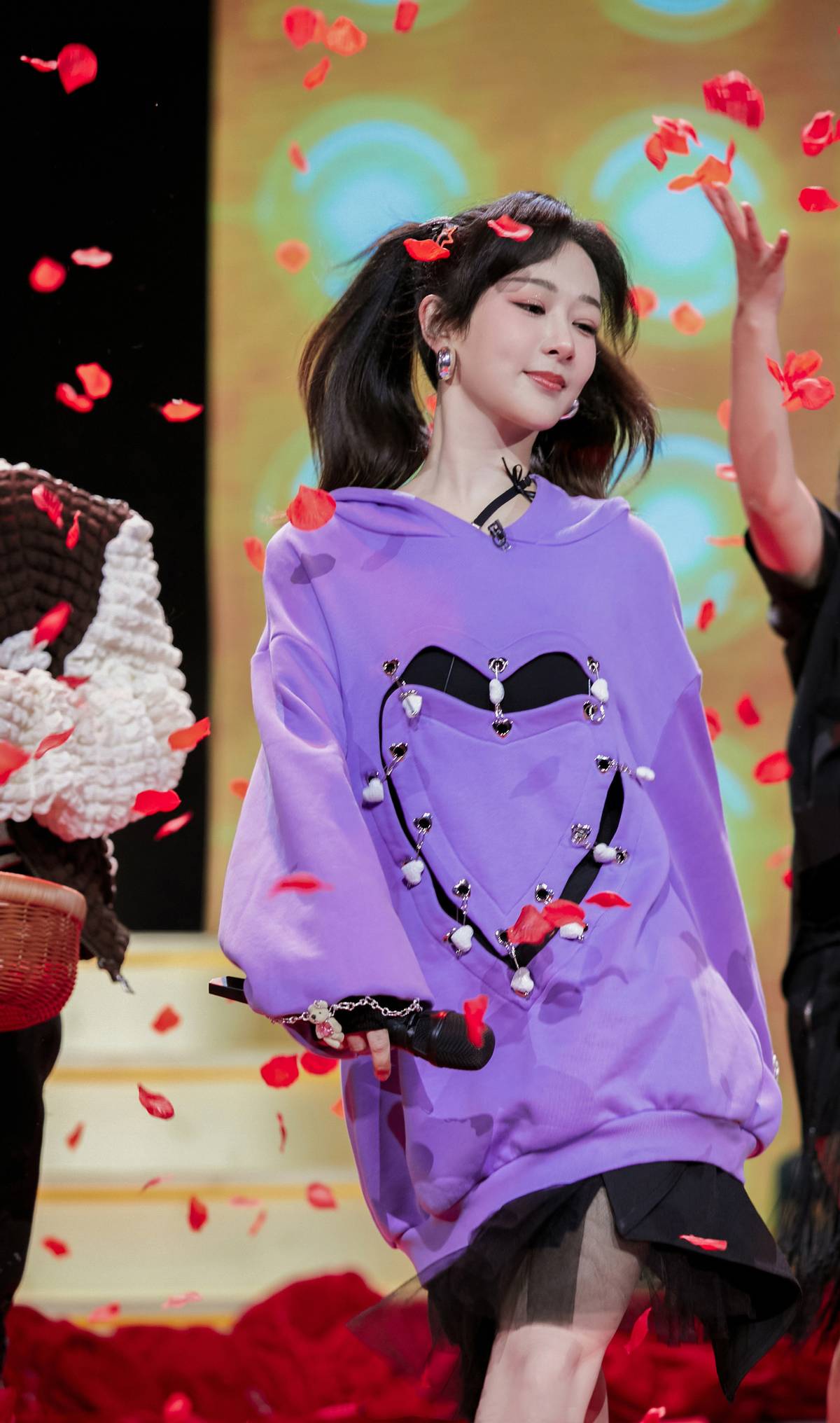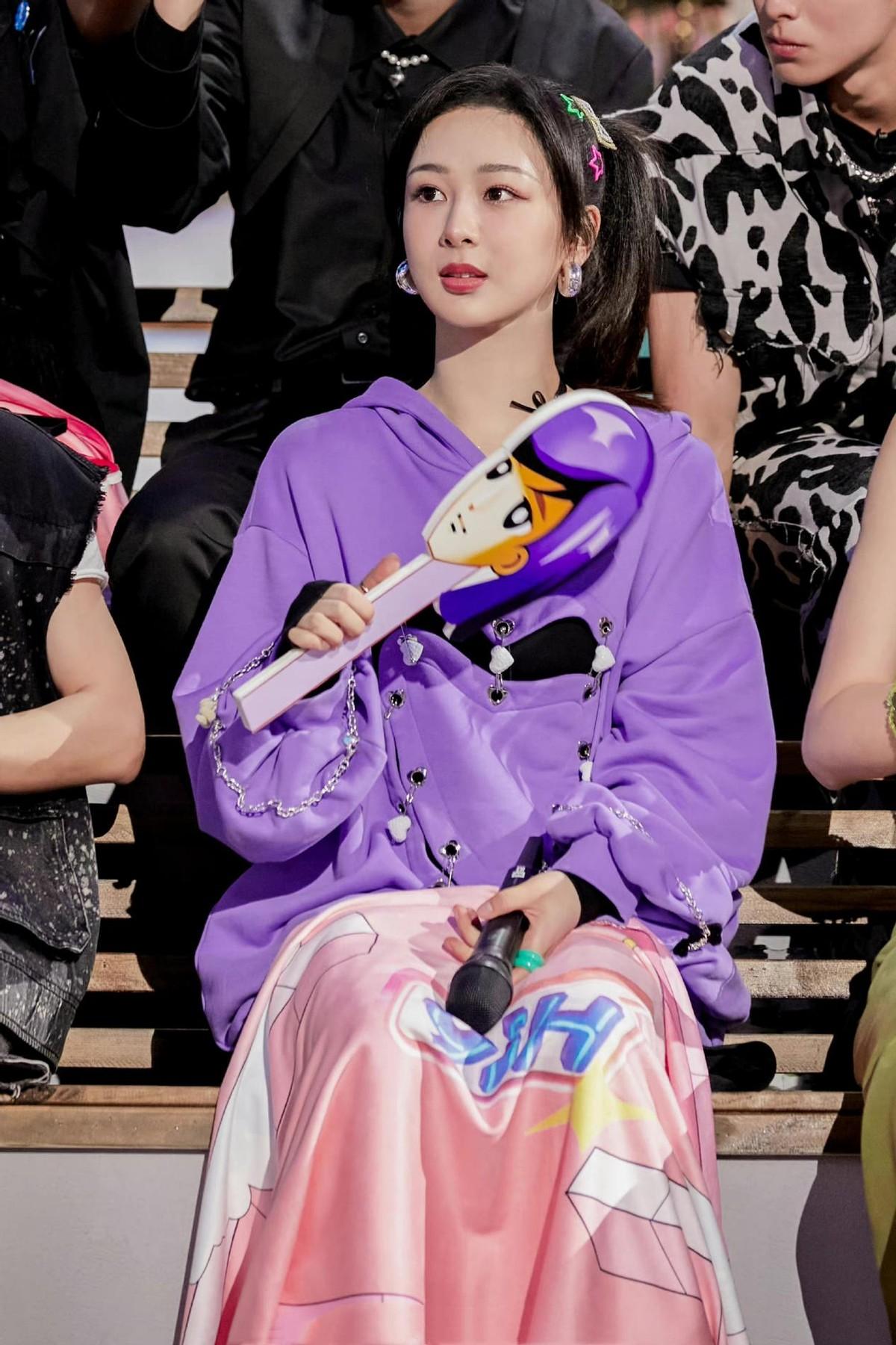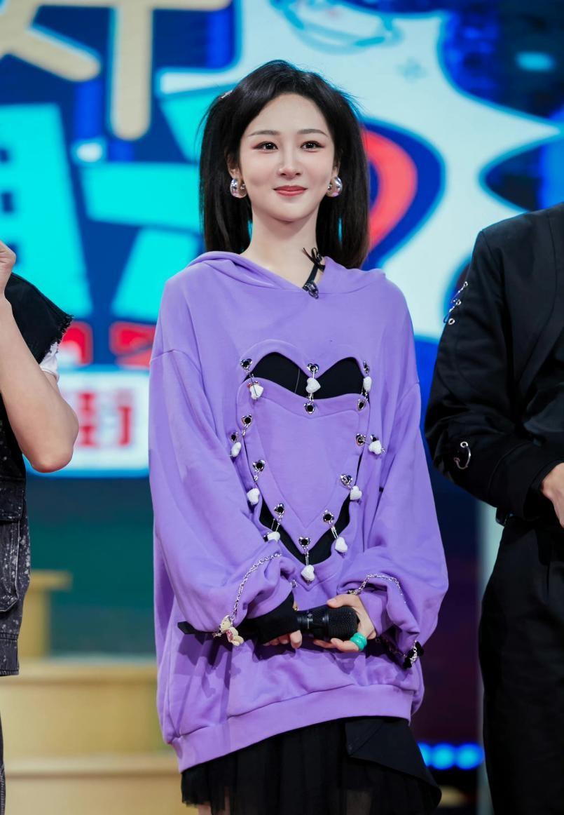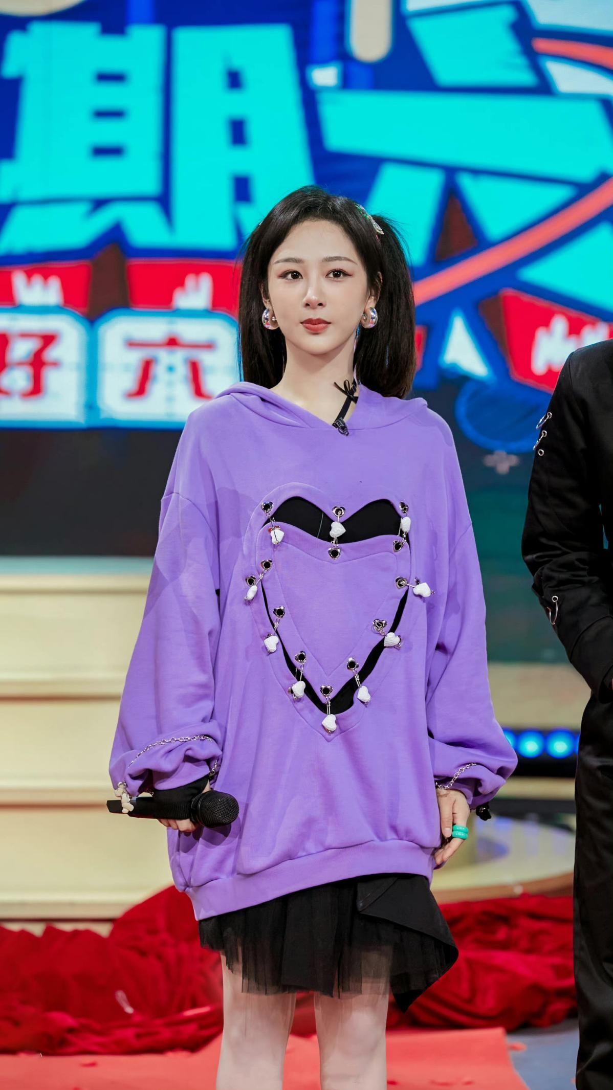 Just like Yang Zi wears in events, adding a purple sweatshirt to the body can not only show her full temperament, but also show her full temperament. It also has a girlish look, and purple is also a very age-reducing color. It is also very suitable for older women. The lower body is paired with a black skirt, and the overall dress is very delicate.