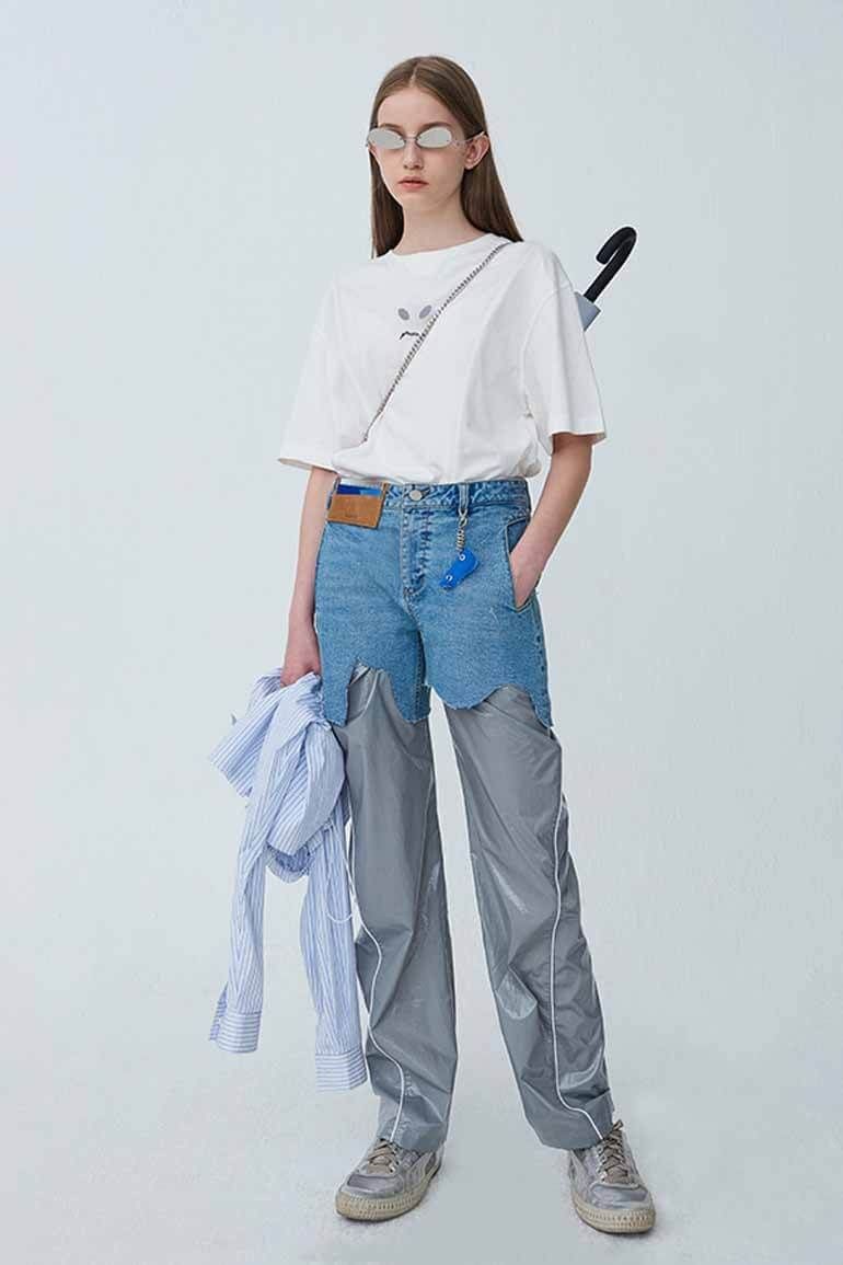 Combining half-cut jeans and gray sweatpants, the integration of the two styles breaks through the original flavor of the two and achieves innovation. . Paired with a white T-shirt, the high-end look is immediately apparent, making it look youthful and innovative.