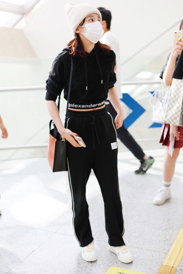 It is also a black sports suit. This outfit uses a navel-baring sweatshirt, which instantly breaks the dull and monotonous feeling of the black series and adds a lot of sexy style and beauty. beauty of. The length of the sweatpants is very basic, simple and plain, and paired with white flat shoes, it is more streamlined and charming. Wearing a white woolen hat echoes the shoes and adds a feminine touch.