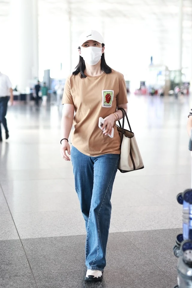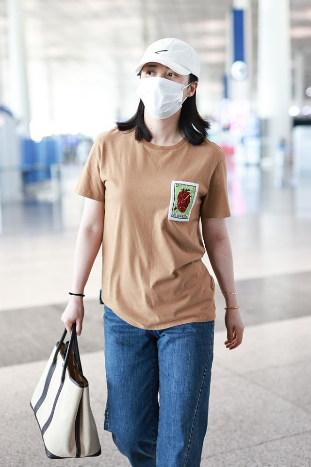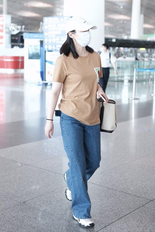 The khaki T-shirt chosen by Jiang Qinqin is of ordinary style and common colors, but in fact khaki is not age-friendly. Fortunately, she has outstanding temperament and can control this age-looking color.